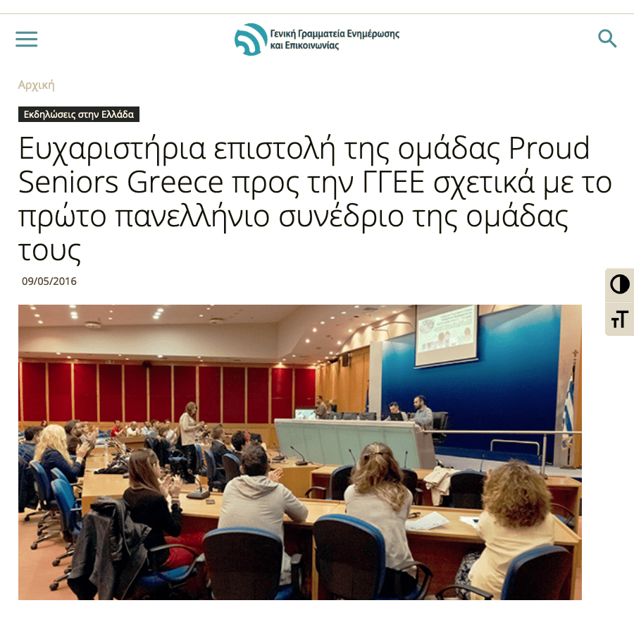 Ευχαριστήρια επιστολή της ομάδας Proud Seniors Greece προς την ΓΓΕΕ σχετικά με το πρώτο πανελλήνιο συνέδριο της ομάδας του